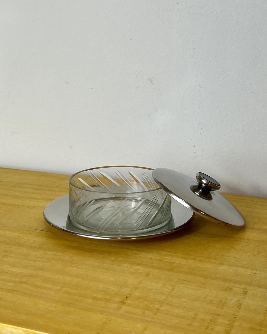 mantegueira, potinho de geléia, açucareiro, etc. em potinho de vidro com base e tampa em aço inox